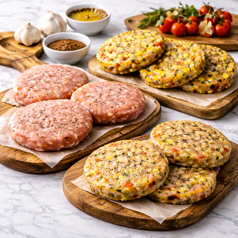 Hamburguesas preparadas para triunfar: opciones de pollo y alternativas con verduras, con una textura jugosa y listas para hacer a la plancha en minutos.